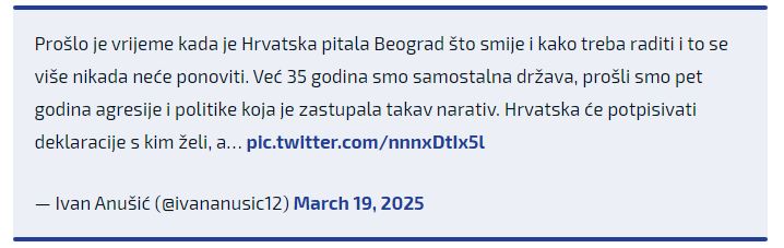 “Prošlo je vrijeme kada je Hrvatska pitala Beograd što smije i kako treba raditi i to se više nikada neće ponoviti. Već 35 godina smo samostalna država, prošli smo pet godina agresije i politike koja je zastupala takav narativ. Hrvatska će potpisivati deklaracije s kim želi, a suradnja s Albanijom i Kosovom usmjerena je na razmjenu znanja, suradnju vojnih industrija, potporu euroatlantskom putu Albanije i Kosova”, napisao je Ivan Anušić na X-u.