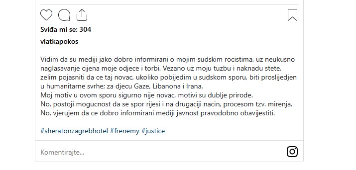 „Želim pojasniti da će taj novac, ukoliko pobijedim, biti proslijeđen u humanitarne svrhe; za djecu Gaze, Libanona i Irana. Moj motiv sigurno nije novac, motivi su dublje prirode“, poručila je Pokos.