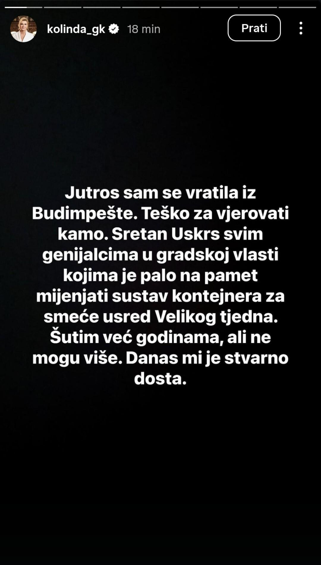 Bivša predsjednica Republike Hrvatske, Kolinda Grabar-Kitarović, prekinula je dugogodišnju šutnju o lokalnim zagrebačkim temama i na društvenim mrežama pokrenula lavinu reakcija. Na svom službenom Instagram profilu objavila je seriju snimki koje prokazuju svu neorganiziranost novog sustava odvoza otpada u samom srcu Zagreba.