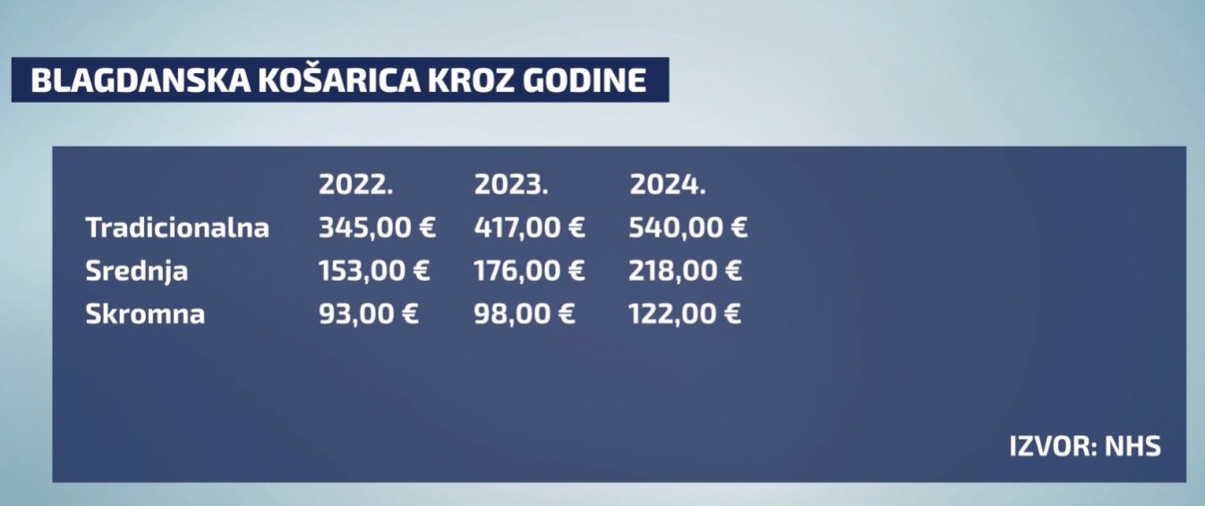 Prema službenim podacima, u samo dvije godine tradicionalna blagdanska košarica poskupjela je više od 56 posto, srednja preko 42, a skromna više od 31 posto. I tome, čini se, još nije kraj. Ovogodišnji prosinac mogao bi donijeti novi cjenovni skok, pa će mnogi blagdanski stolovi biti skromniji nego što su bili navikli.