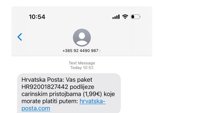 Putem SMS poruka širi se lažna obavijest o nemogućnosti dostave paketa zbog neplaćenih carinskih pristojbi. Nemojte otvarati poveznice koje se u njima nalaze jer se time izlažete riziku od krađe vlastitih bankovnih podataka, savjetuju iz Hrvatske pošte.