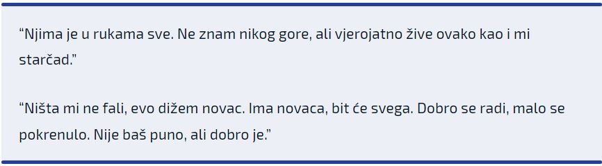 218 kilometara dalje, uz more, ista izborna jedinica, no drugi problemi za mještane Matulja: “Ja nemam od danas do jutra, ja ću krepati od gladi. Divlje svinje nam prihajaju”, kaže jedna umirovljenica.