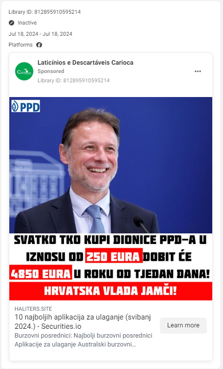 Lažni oglas s naslovom: “Svatko tko kupi dionice PPD-a u iznosu od 250 eura dobit će 4.850 eura u roku od tjedan dana! Hrvatska Vlada jamči!” pojavio se na društvenoj mreži Facebook i koristi fotografiju predsjednika Hrvatskoga sabora u svrhu navodnog promoviranja kupnje dionica jednog hrvatskog trgovačkog društva.