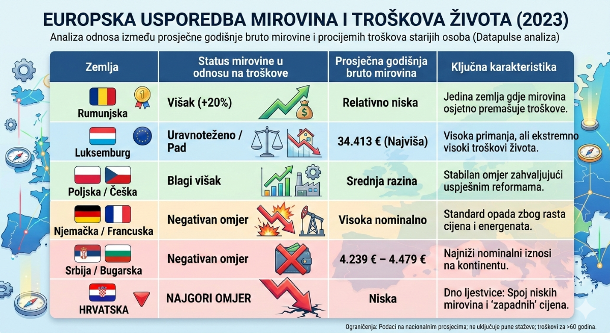 Biti umirovljenik u Europi 2023. godine u većini je zemalja značilo precizno balansiranje na rubu održivosti, no najnovija analiza podataka servisa Datapulse otkriva poraznu istinu za domaće prilike: Hrvatska se po omjeru mirovina i troškova života nalazi na samom dnu starog kontinenta. Dok se u nekim državama mirovinski čekovi još nekako hrvaju s inflacijom, kod nas je taj jaz postao nepremostiva provalija.