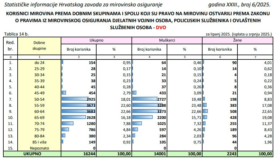 Zatim, 3.671 umirovljenik ima između 55 i 59 godina od čega je 3.288 muškaraca i 308 žena. Djelatnih vojnih osoba, policajaca i ovlaštenih službenih osoba u mirovini koje imaju između 50 i 54 godine ukupno je 2.925 pri čemu je također više muškaraca (2.727) nego žena (198), prema podacima Zavoda za mirovinsko osiguranje piše Mirovina.hr