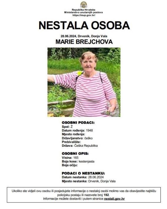 Jučer je prijavljen nestanak Čehinje Marije Brejchove (78) koja se udaljila iz mjesta Drvenik, Donja Vala. U potragu su se sinoć uključili i pripadnici HGSS-a te vatrogasci, a nastavlja se i danas.
