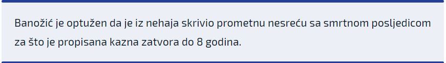 Okrivljenik je, tereti ga se, uslijed opisanog, na lijevoj prometnoj traci prednjim dijelom svog vozila udario u prednji lijevi dio teretnog vozila koje se kretalo iz suprotnog smjera pri čemu je 41-godišnji vozač tog vozila preminuo na mjestu nesreće zbog zadobivenih višestrukih ozljeda.