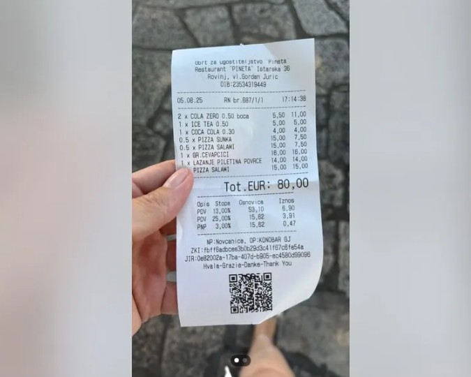 Račun otkriva da pola litre Coca-Cole Zero stoji 5,50 eura, obična Cola od 0,3 litre četiri eura, a ledeni čaj pet eura. Ni hrana nije pošteđena cjenovne spirale – pola pizze sa šunkom ili salamom naplaćuje se 7,50 eura, cijela 15 eura, porcija ćevapčića 16 eura, a lazanje s piletinom i povrćem 14 eura. Turisti su za objed ukupno izdvojili 80 eura.