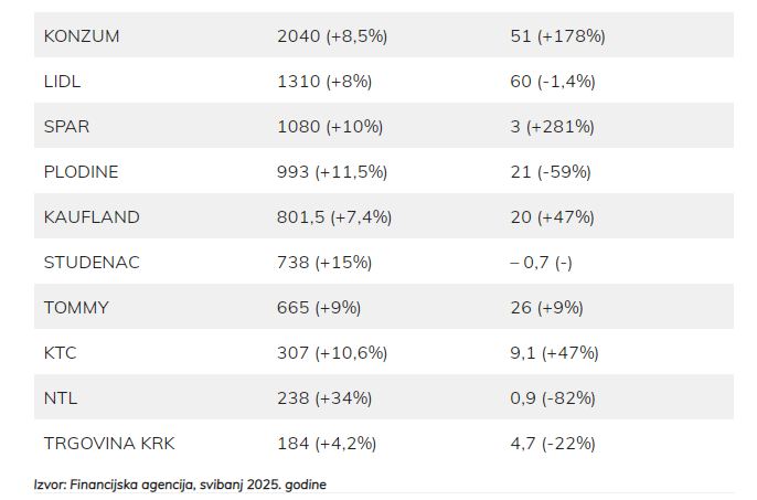 Prema službenim podacima Financijske agencije, Konzum je lani ostvario više od 50 milijuna eura čiste dobiti, što je čak 178 posto više nego godinu ranije. Uvjerljivo je najveći poslodavac u sektoru trgovine s više od 10.000 zaposlenih, ali plaće su i dalje vrlo skromne.