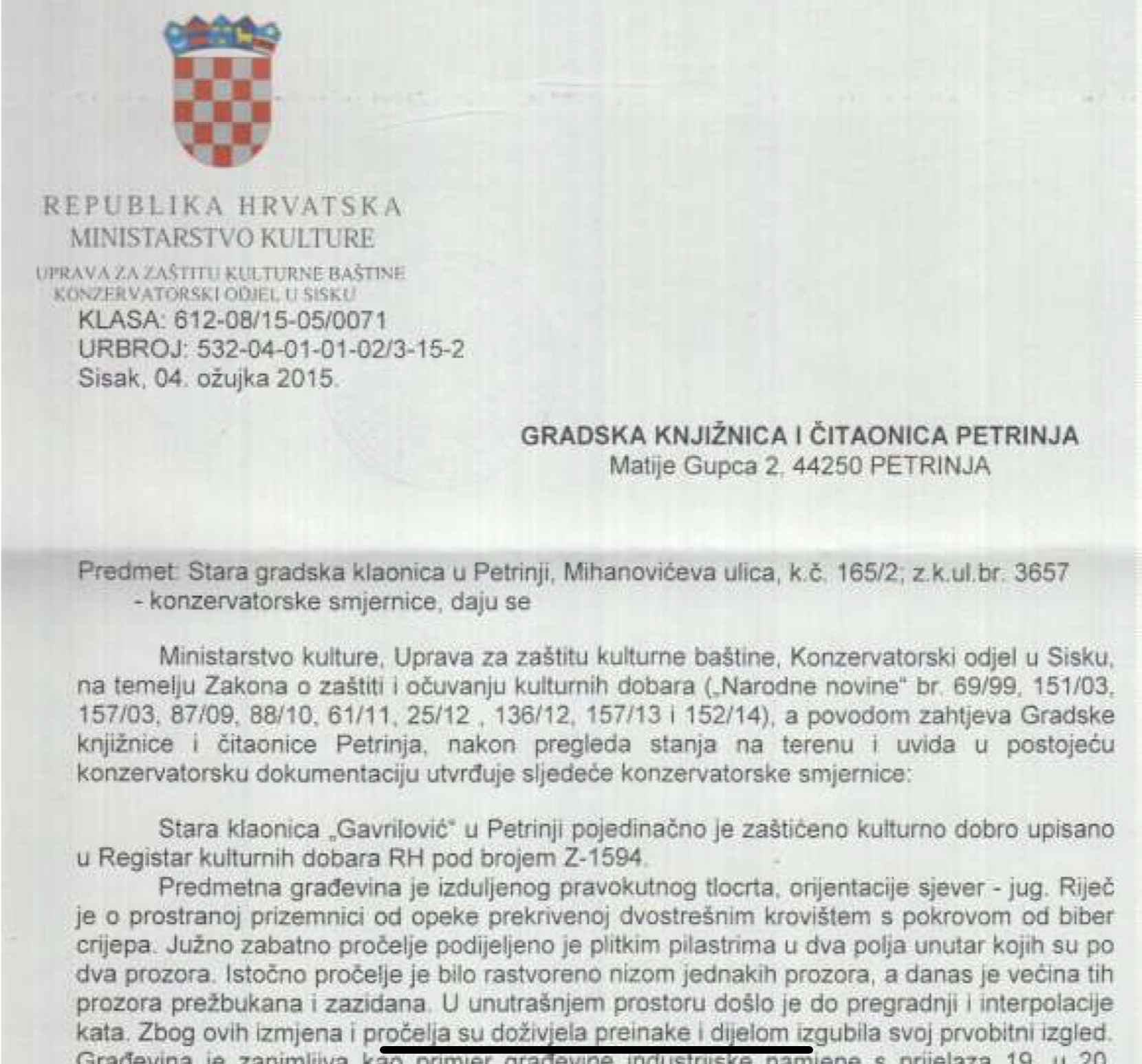 Ministarstvo kulture, Uprava za zaštitu kulturne baštine, Konzervatorski odjel Sisak poslao je Gradskoj knjižnici i čitaonici odgovor na predmet Stare gradske klaonice.