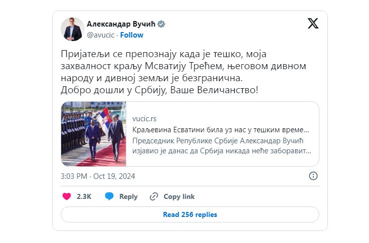 “Čestitam Donaldu Trumpu na pobjedi. Zajedno se suočavamo s ozbiljnim izazovima koji su pred nama. Srbija je posvećena suradnji s SAD-om na stabilnosti, prosperitetu i miru”, napisao je srpski predsjednik Aleksandar Vučić na X-u.