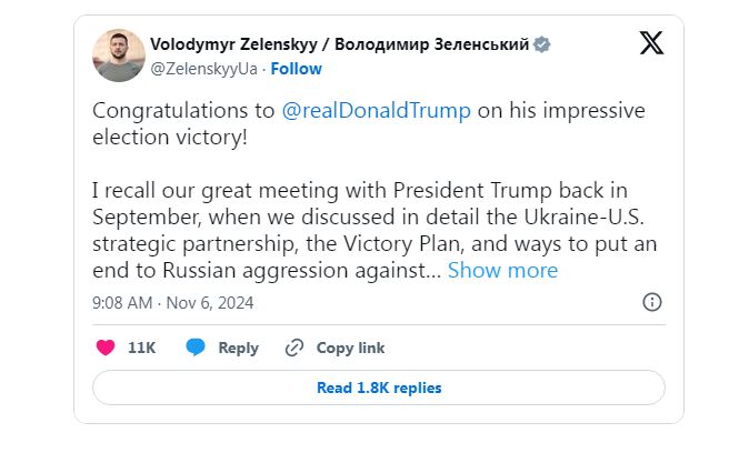 Veselim se što ću osobno čestitati predsjedniku Trumpu i razgovarati o načinima jačanja strateškog partnerstva Ukrajine sa Sjedinjenim Državama”, napisao je Zelenski na platformi X.