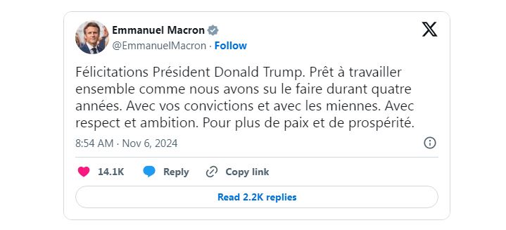 “Čestitke predsjedniku Donaldu Trumpu. Spremni smo na suradnju kao što smo to radili već četiri godine. S tvojim i s mojim uvjerenjima. S poštovanjem i ambicijom. Za više mira i blagostanja”, poručio je Emmanuel Macron.