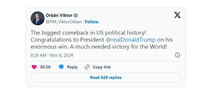 “Najveći povratak u političkoj povijesti SAD-a! Čestitke predsjedniku Donaldu Trumpu na njegovoj ogromnoj pobjedi. Prijeko potrebna pobjeda za svijet”, napisao je na X-u Viktor Orban.