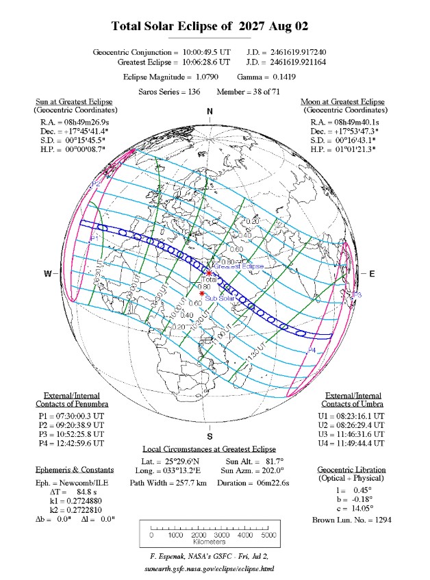 Prema NASA-inom kalendaru pomrčina Sunca, najduža pomrčina u posljednjih 100 godina dogodit će se 2. kolovoza 2027. Njena totalna faza trajat će 6 minuta i 23 sekunde. Tijekom tog vremena dijelovi Europe, Sjeverne Afrike i Bliskog istoka bit će pod Mjesečevom sjenom.