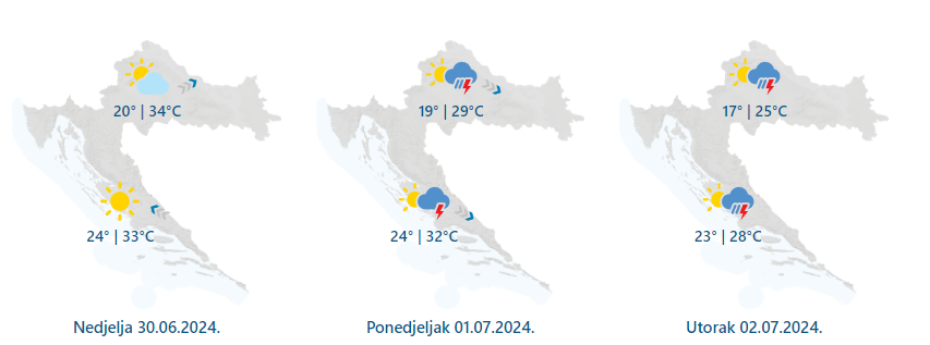 U nedjelju pretežno sunčano i vruće. Poslijepodne ponegdje u unutrašnjosti umjeren i jak razvoj oblaka uz mogućnost za poneki lokalni pljusak, uglavnom u Slavoniji. Vjetar slab do umjeren jugozapadni i južni, na istoku jugoistočni. Na Jadranu slabo do umjereno jugo, mjestimice moguće jako. Najniža jutarnja temperatura od 16 do 21, na Jadranu između 21 i 26, a najviša dnevna uglavnom od 30 do 35 °C.
