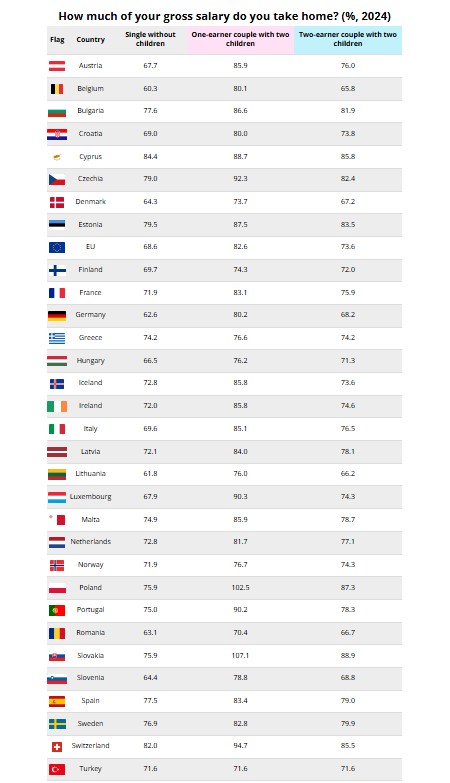 U samo osam zemalja porast je veći od 5 postotnih bodova, što sugerira da obiteljske naknade često ne dovode do znatnog povećanja neto plaće. U 2024., u EU-u, samac bez djece koji zarađuje 100 % prosječne plaće kući odnese 29.573 € od bruto iznosa od 43.105 €.