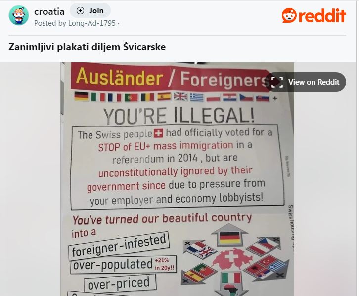 Rasprava na Redditu koju je pokrenuo korisnik objavom plakata iz Švicarske izazvala je veliku pažnju, posebice zbog toga što je spomenuo značajnu hrvatsku zajednicu u toj zemlji. Iako je u objavi naveo brojku od oko 200.000 Hrvata u Švicarskoj, podaci iz Središnjeg ureda za Hrvate izvan Republike Hrvatske govore da ih je zapravo oko 80.000.