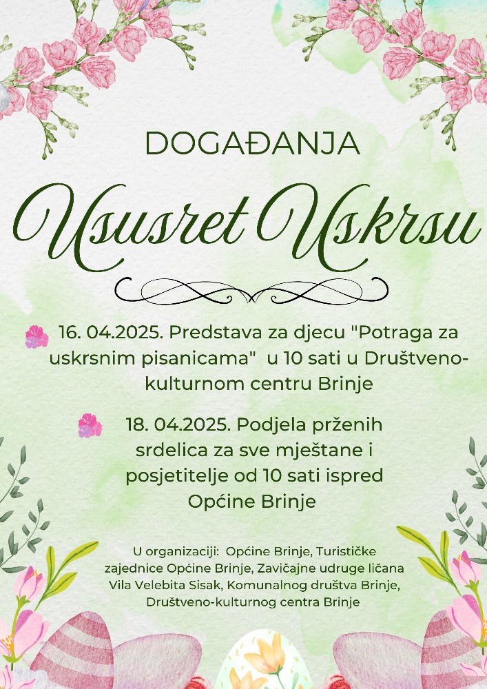 Općina Brinje i Turistička zajednica Općine Brinje pozivaju sve posjetitelje i mještane da nam se pridruže u jednom od najljepših razdoblja godine. Za naše najmlađe pripremili smo 16.04.2025. prekrasnu uskrsnu predstavu u Društveno-kulturni centar u Općini Brinje, a dana 18.04.2025. organizirali smo podjelu prženih srdelica ispred Općine Brinje.