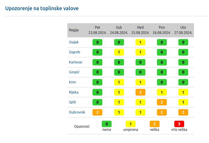 Jutarnje temperature u unutrašnjosti od 17 do 20 na Jadranu od 22 do 27C. Najviše dnevne temperature od 32 do 38. Uz Jadran će maestral poslijepodne donositi osvježenje. Temperatura mora od 25 do 27, UV indeks vrlo visok.